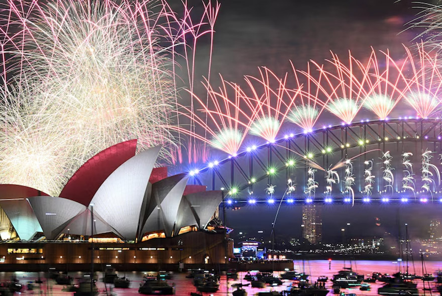 آتشبازی اصلی نیمهشب از پل بندرگاه سیدنی، خانه اپرای سیدنی و دیگر نمادهای شهری شلیک میشود.