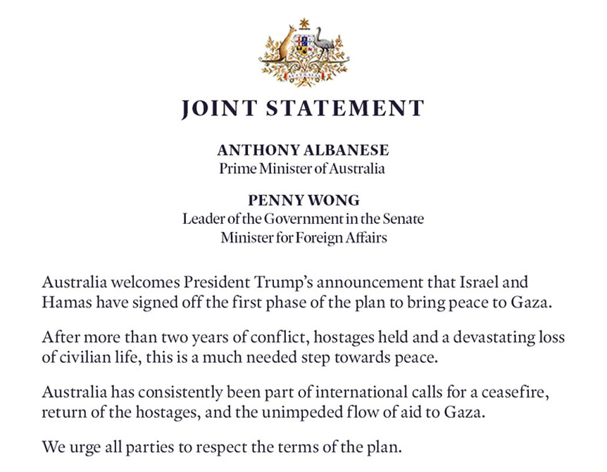 در بیانیه مشترکی که امروز پنجشنبه ۹ اکتبر ۲۰۲۵ منتشر شد، نخستوزیر استرالیا آنتونی آلبانیزی و وزیر امور خارجه پنی ونگ این توافق را گامی ضروری در جهت صلح توصیف کردند.