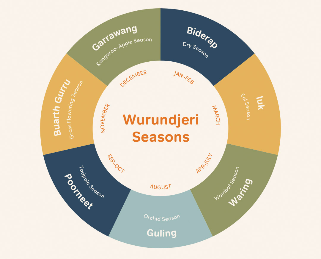 جکی واندین، زن بومی وورونجری، میگوید: فصلهای بومی بهتر میتوانند تغییرات را نشان دهند. Biderap با گرمای شدید همراه است و Luk فرصتی برای بازاندیشی و یادگیری فراهم میکند. فصل Guling، با شکوفهدادن درختان طلائی، یادآور عموی باراک، قهرمان حقوق مدنی ماست.» عموی باراک در اواخر قرن نوزدهم یکی از فعالان برجسته حقوق بومیان ویکتوریا بود.