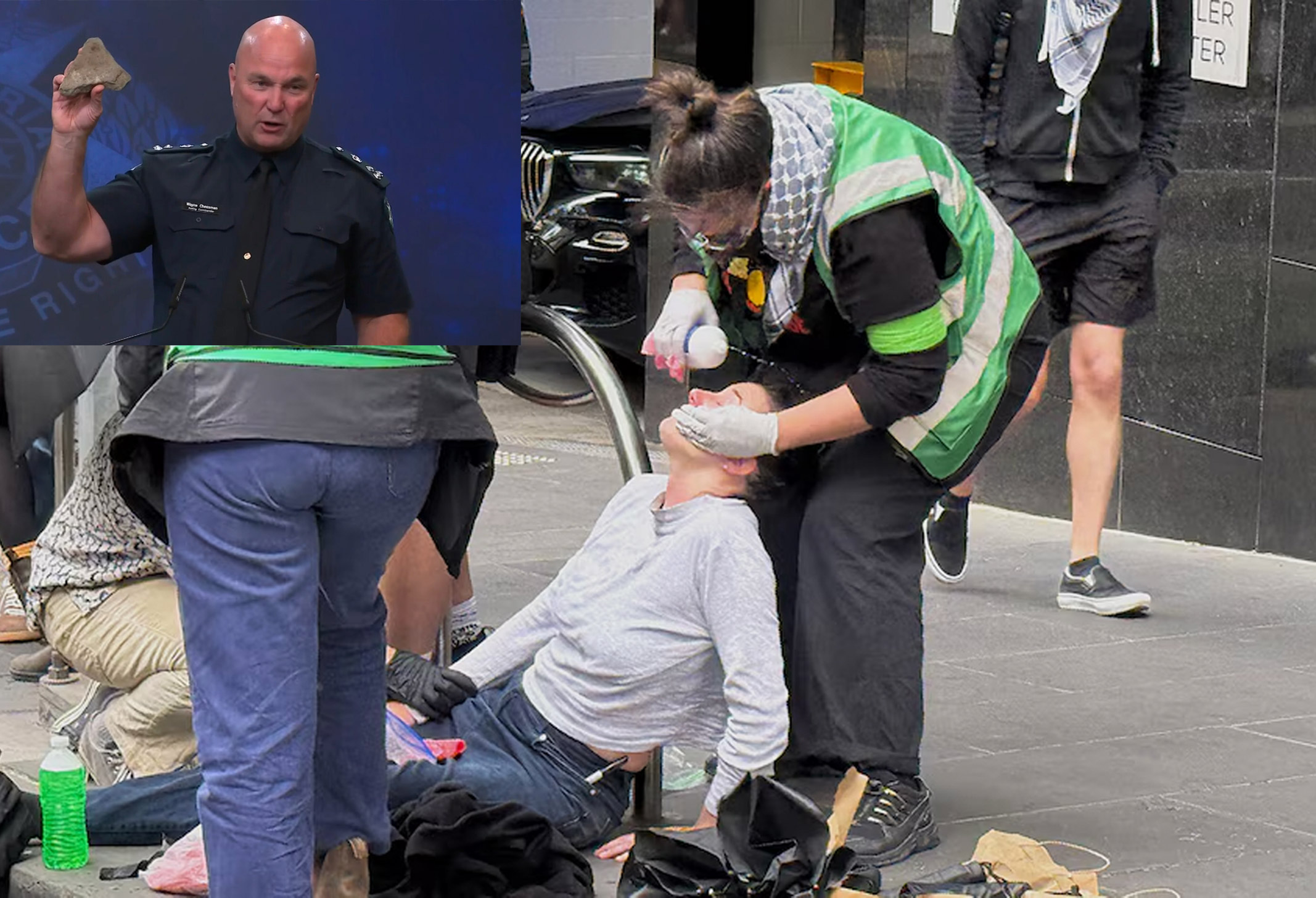 وین چیزمن، از افسران ارشد پلیس ویکتوریا در یک کنفرانس خبری، با عصبانیت گفت معترضان با سنگهای مشابه سنگهای مسیر راهآهن، بطریهای حاوی خردهشیشه و حتی میوه به سمت مأموران حمله کردهاند.